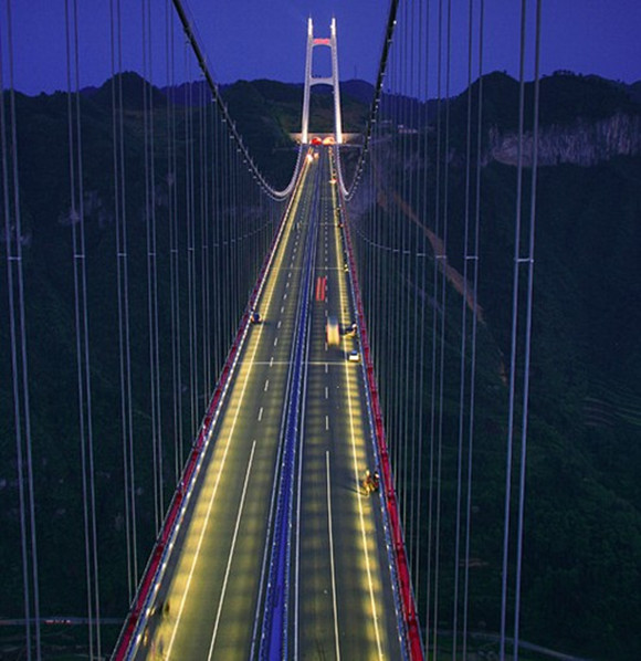 矮寨特大悬索桥,位于湖南湘西矮寨镇境内。矮寨悬索桥,距吉首市区约20公里,跨越矮寨镇附近的山谷,德夯河流经谷底,桥面设计标高与地面高差达330米左右。桥型方案为钢桁加劲梁单跨悬索桥,全1073.65m,悬索桥的主跨为1176m。该桥跨越矮寨大峡谷,主跨居世界第三、亚洲第一。工程计划投入7.2亿元,占吉茶高速公路计划总投资的15%。2012年3月底,创4项世界第一的湖南矮寨特大悬索桥正式通车。